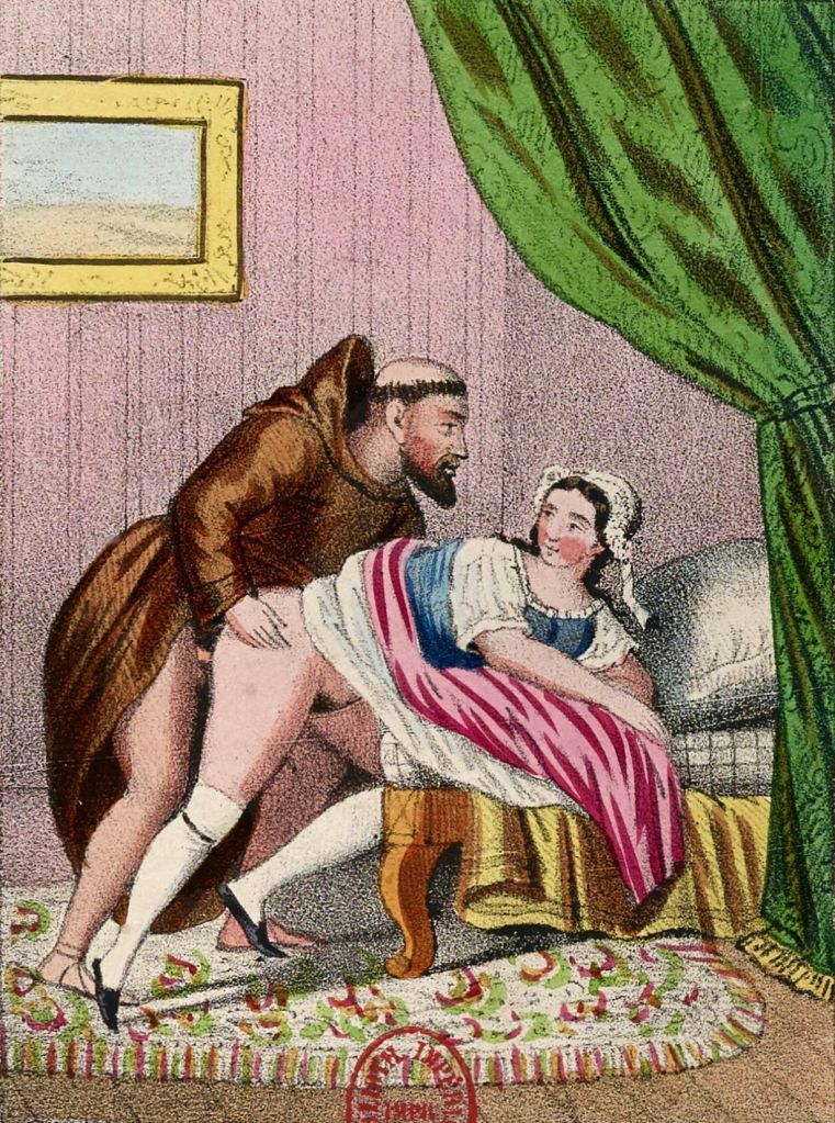 Vi fördrev tiden med att läsa erotisk litteratur som vi tagit med oss från Paraná, sedan besökarna slutat komma – jag tyckte särskilt om de filosofiskt utmanande av Sainte-Beuve och Alfred de Musset. De handlade ofta om munkar och nunnor, och jag läste röd i ansiktet om erigerade penisar och våta trånande sköten under de vida kåporna och nunnedoken, fast min mästare ständigt varnade mig för sådan omoralisk läsning.
